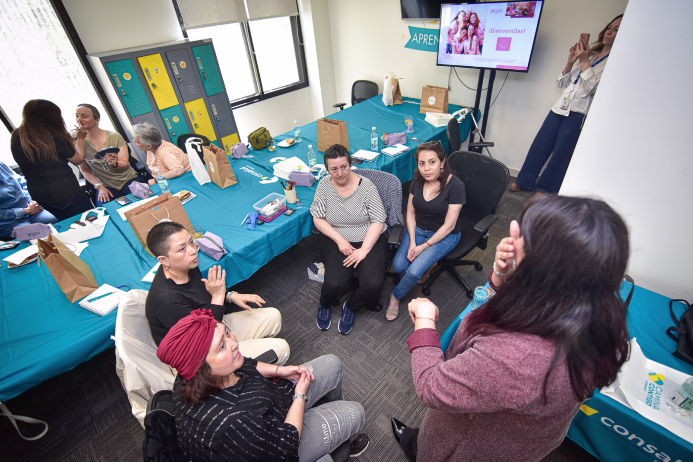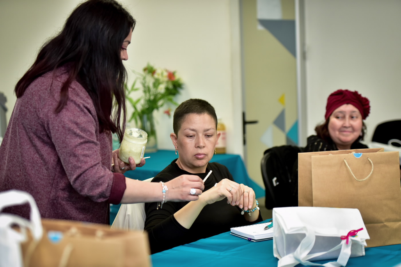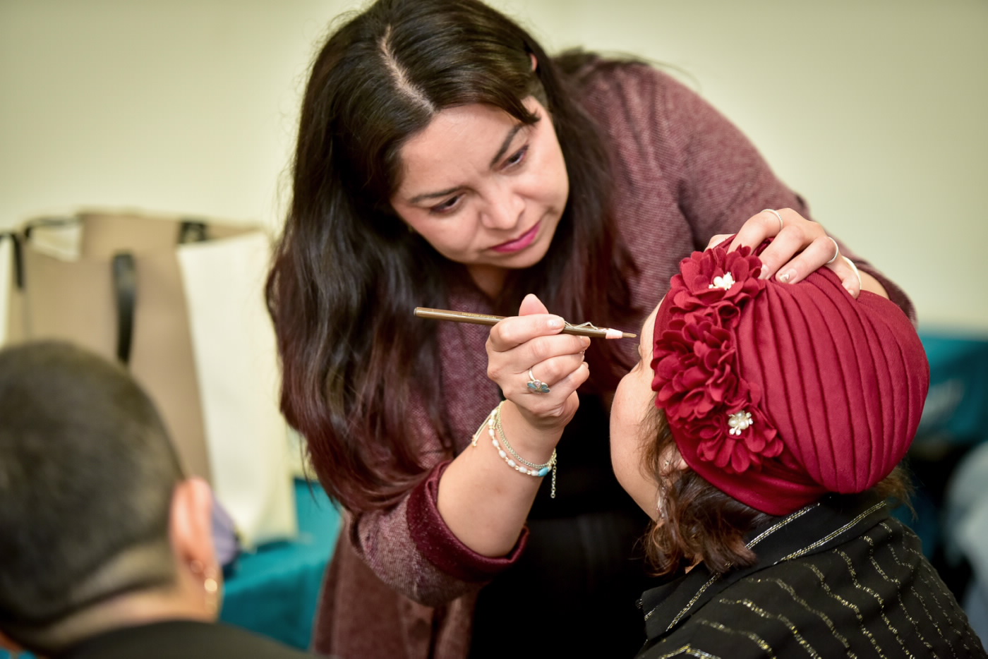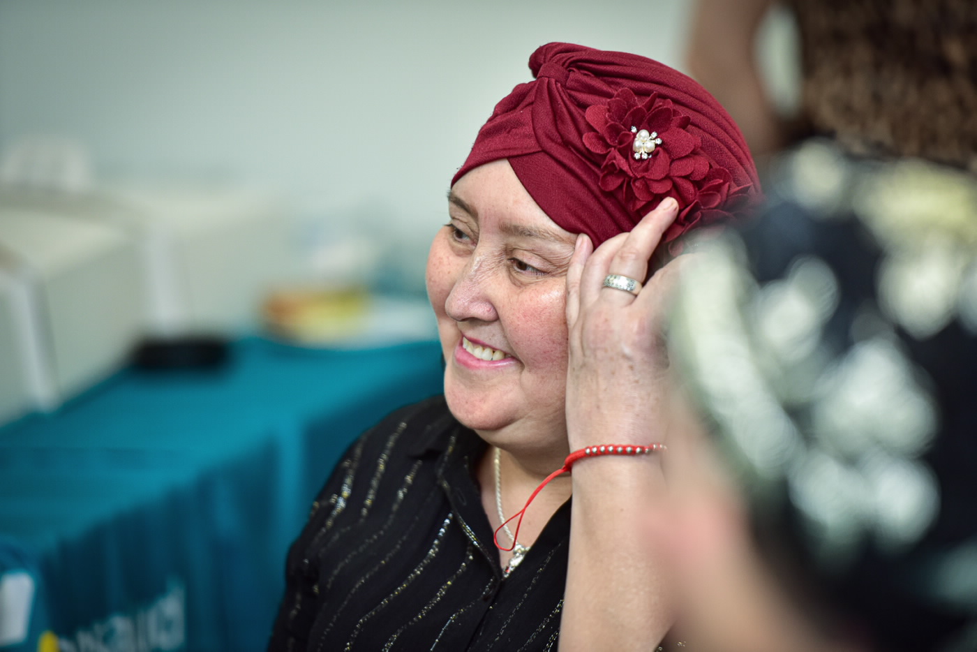 Patricia Santibañez, Cosmetóloga - Especialista en estética oncológica y directora de la Fundación Oncounidas, fue quien dirigió estos talleres donde las participantes aprendieron sobre cuidados de la piel, tips de maquillaje correctivo, consejos prácticos para resaltar su rostro, uso de pañuelos y turbantes, además de compartir momentos de conversación y apoyo mutuo.